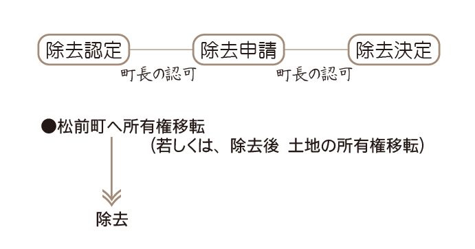 松前町では老朽放置建物がある土地や管理放棄地を町に寄付してもらい、町が建物の除去を行うか、工事費用の補助を行う取組を行っています。