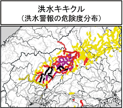「キキクル(⼤⾬警報・洪⽔警報の危険度分布)」は、土砂災害、浸水害、洪水災害発生の危険度の高まりを地図上で5段階に色分けして表示したもので、常時10分毎に更新しています。