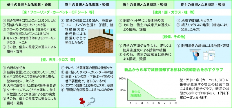 退去時の原状回復について考える際に、退去するまでの間に、建物価値がどれくらい減少したかを整理することが重要です。国土交通省が発行したガイドラインでは、貸主と借主の費用負担について次のように整理しています。